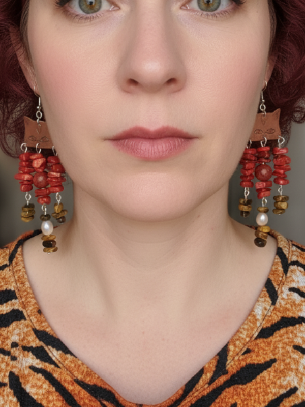 These spectacular one of a kind original design copper cat earrings are a handmade using quality red coral chip beads and tiger eye chip beads. They have a red jasper and pearl added too.